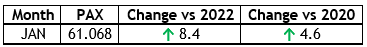 Sarajevo Airport welcomed 61.068 passengers during the first month of the year, improving its figures over both last year and the pre-pandemic January of 2020. The result was achieved despite Wizz Air no longer having a base in the city and only serving two routes from Bosnia and Herzegovina’s capital. Furthermore, Sarajevo Airport was hit by several flight diversions in January as a result of adverse weather conditions. It registered a total of 809 aircraft movements during the month.